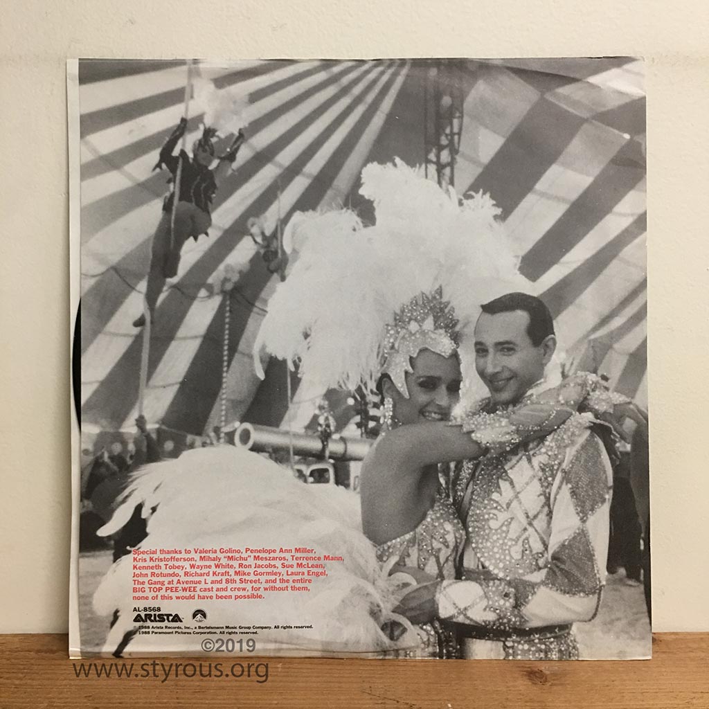Hype sticker on the front cover says: "Specially priced! Free inside: 5 really cool, limited edition, collectible Pee-Wee postcards from the smash movie. Also includes the story of Big Top Pee-Wee plus music and dialogue performed by the original cast. AL-8568".